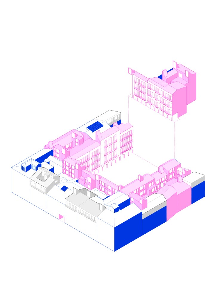 La colonización pública de la plaza se ejecuta en dos planos diferenciados, que permiten convertir una estrategia puntual en un modelo de actuación en el municipio y otras localidades pirenaicas. La colonización como concepto de proyecto. El surgir de los lucernarios en cubierta para poder captar iluminación solar y ventilación natural en zonas densas y delicadas programáticamente. En este caso, los lucernarios se utilizan fundamentalmente para iluminar zonas comunes, escaleras y otros elementos en la frontera entre lo público y lo privado.