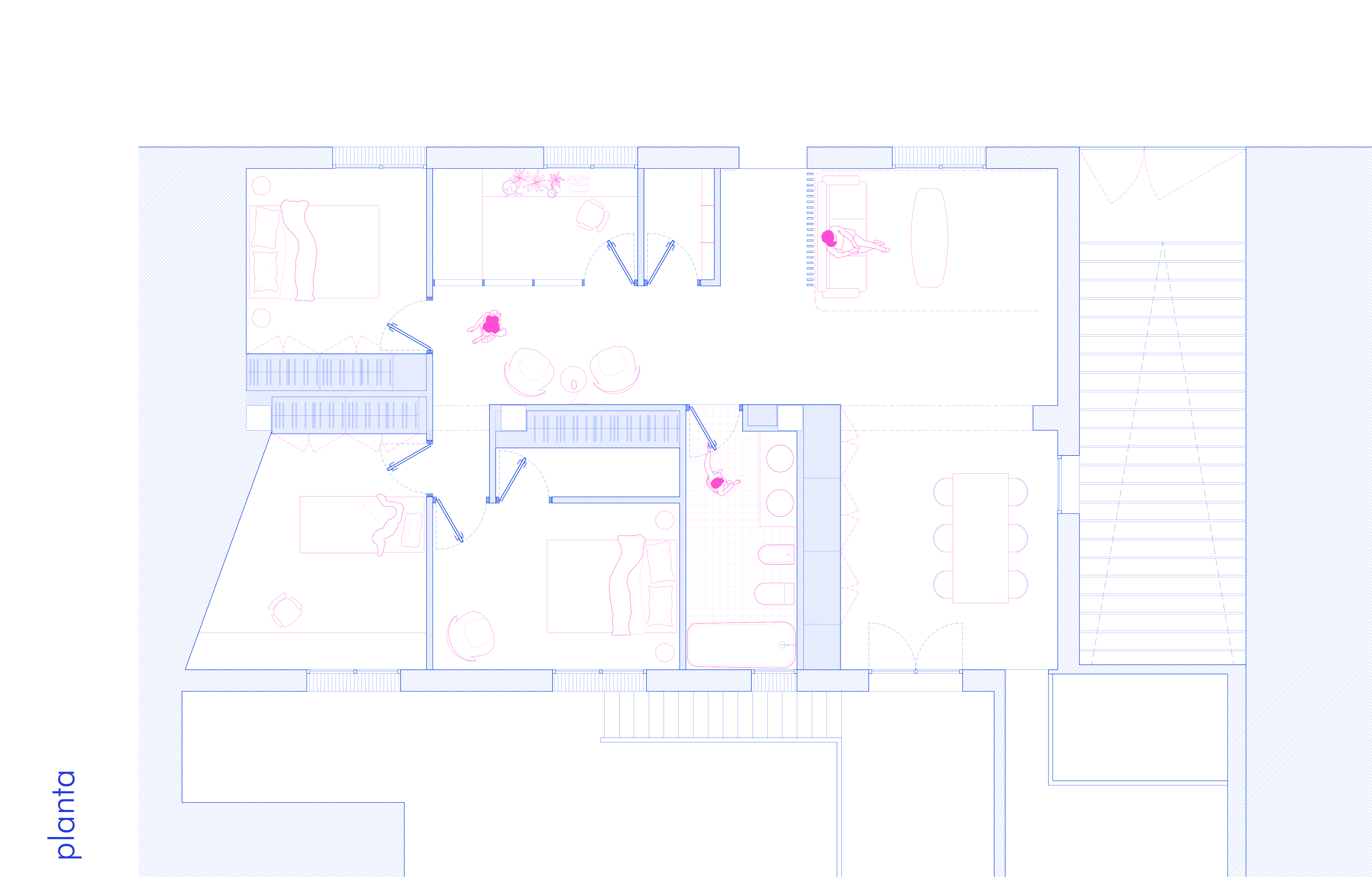 El proyecto plantea reformular el pasillo como el corazón de la vivienda, lugar de estar y charlar. Espacio que se amplía hacia la calle con un jardín de invierno, con posibilidad de eliminar la mampara y establecer un espacio con [todavía] más posibilidades.