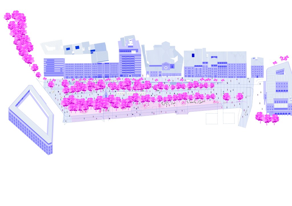 Un diafragma verde en el interior de Pamplona, que integra y diluye la Taconera en la trama actual, potenciando la presencia verde, pero manteniendo un espacio útil para la ciudadanía con una gran superficie unitaria.