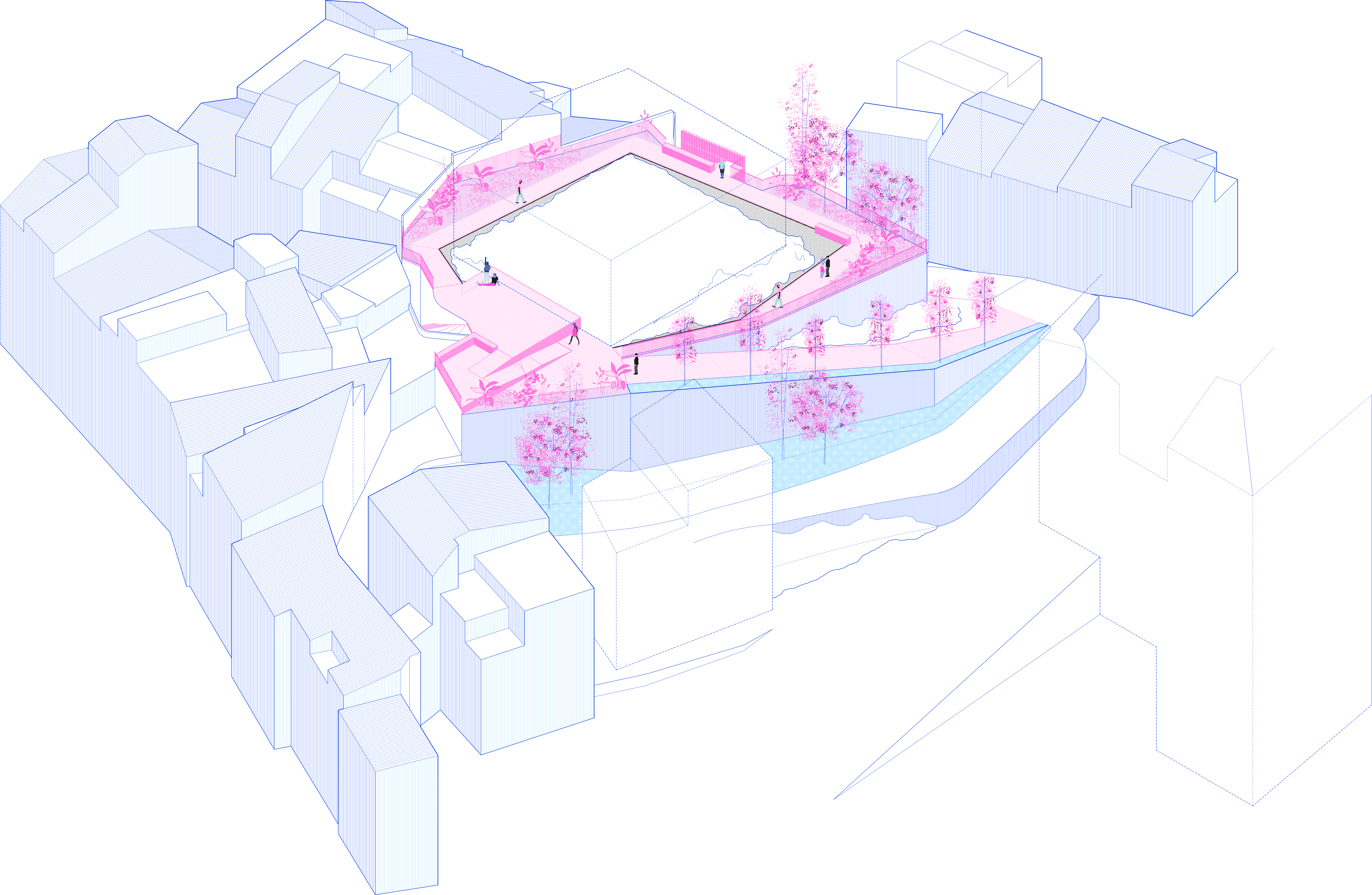 La propuesta urbana se basa en los conceptos de cubierta y paisaje mediante la pavimentación cerámica de la zona norte, con ecos tectónicos y cromáticos de las cubiertas del municipio; y la creación de espacios vegetalizantes informales en la zona sur, introduciendo la naturaleza autóctona en la propuesta.