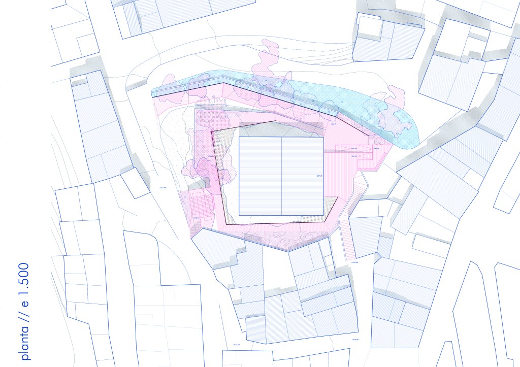 El emplazamiento de la propuesta se sitúa coronando el municipio, con potentes vista al entorno natural. Esta situación permite contemplar dos mundos opuestos: el mundo de lo construido, fragmentándose en decenas de cubiertas inclindas de teja; y la naturaleza próxima, de intrínseco valor paisajístico. De esta forma, la actuación recoge esta doble vertiente a la que se enfrenta el emplazamiento para integrarlas en su espacio público: cubierta y paisaje.